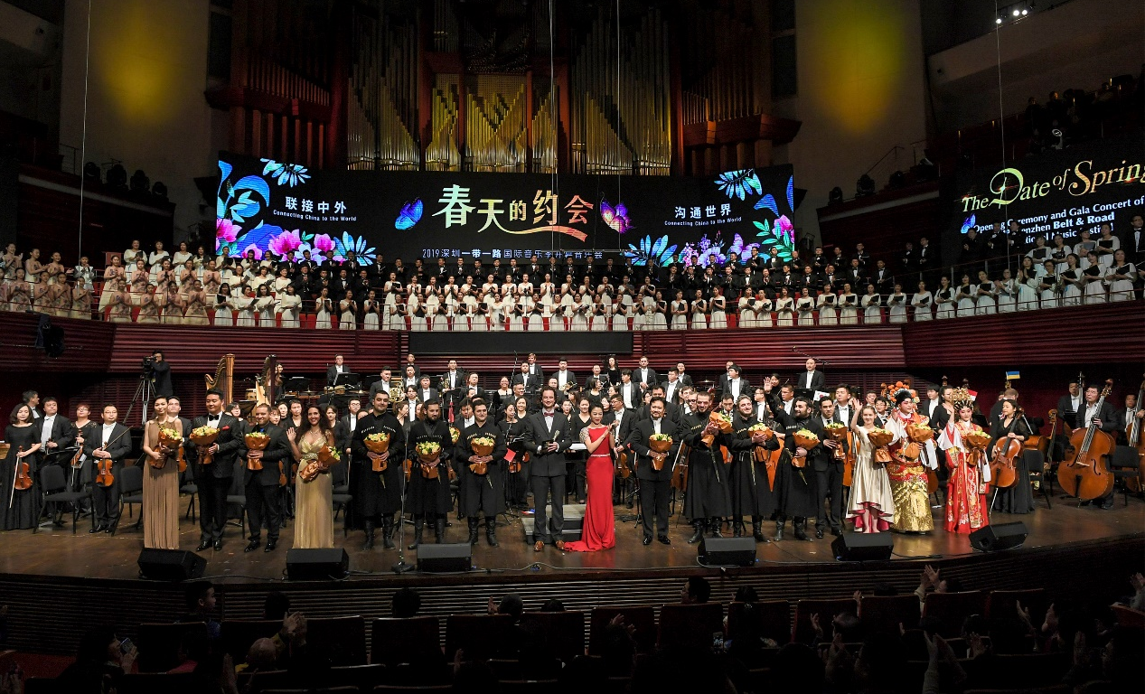 2019深圳“一帶一路”國際音樂季開幕式,不同國籍、不同膚色的各國音樂家們一一登臺,共同向觀眾致意。