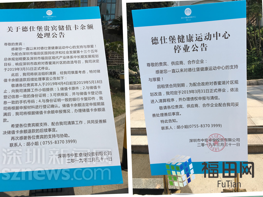 公告牌顯示,因租賃合同到期,為配合政府對香蜜湖片區(qū)規(guī)劃改造,德仕堡健康運動中心定于2019年3月31日正式停業(yè)。