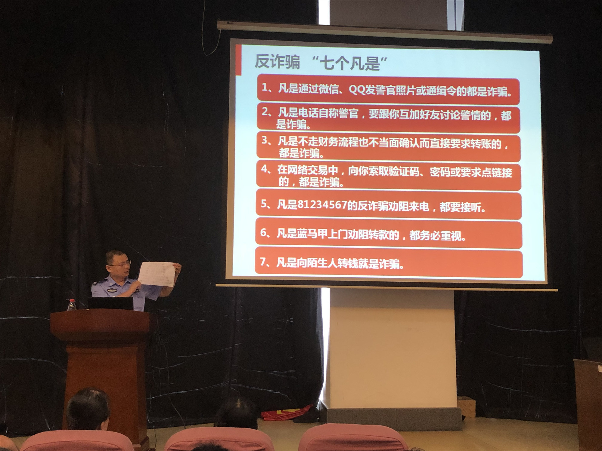 4月12日下午,惠杰副所長、社區(qū)民警黃旭波、孫立波在財富廣場小禮堂開展香蜜湖“反詐騙課堂”第一場,向財富廣場各公司負(fù)責(zé)人、財務(wù)人員開展反詐騙宣傳,“反詐騙宣傳”PPT包含反詐騙工作面臨的嚴(yán)峻形式、電信詐騙的常見手段、各類案例及宣傳視頻、電信詐騙的防范要點、以及社區(qū)民警的微信二維碼名片等等。此次宣傳借用大廈的會議室、物業(yè)單位的小禮堂,將本樓的商戶、公司集中在一起,形成區(qū)域效應(yīng);突出重點人員,主要針對單位負(fù)責(zé)人、財務(wù)人員,切實提高居民自我防范意識。