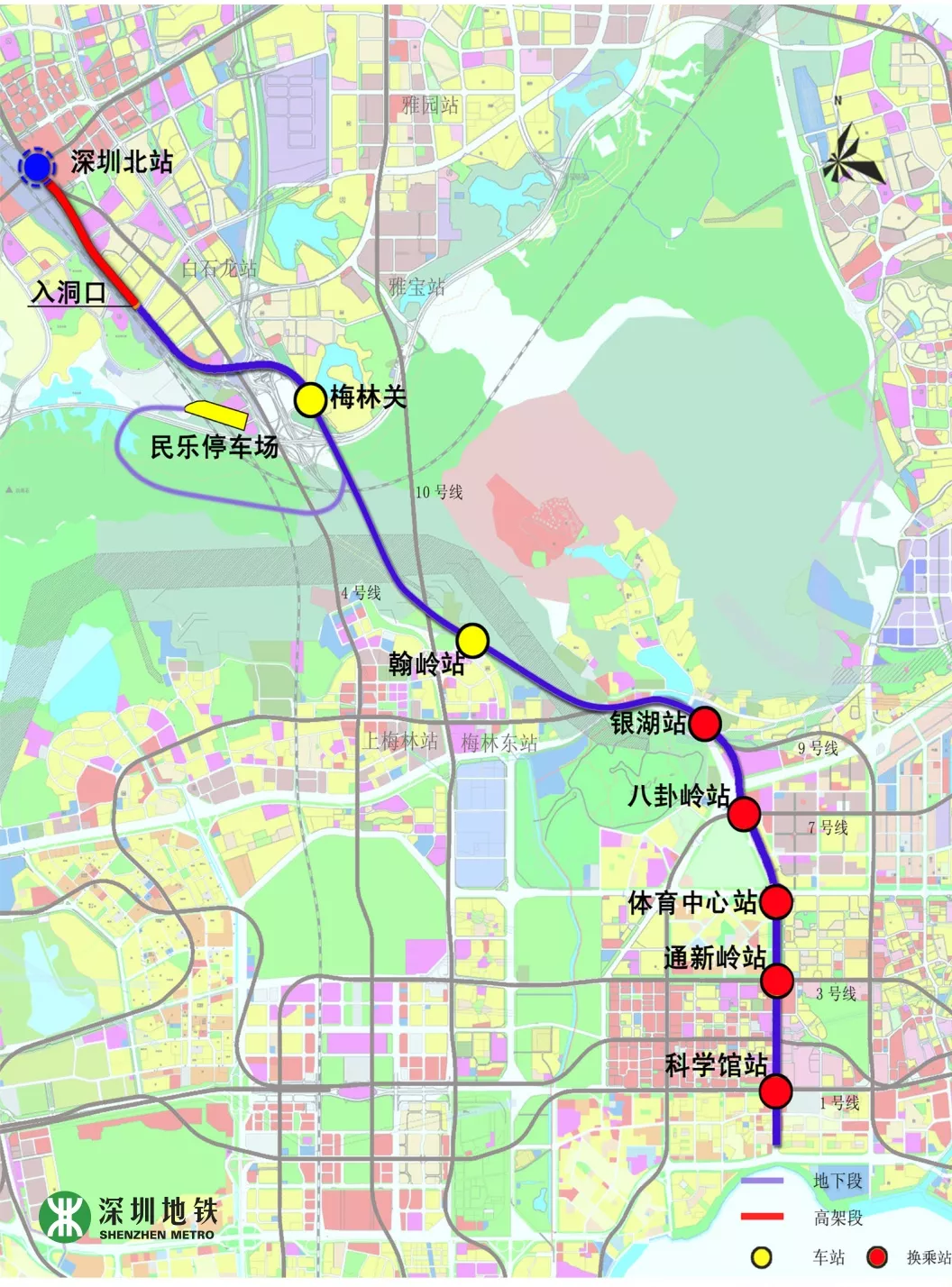 6號線二期工程線路全長約11.8km,換乘車站5座,線路從深圳北站預(yù)留高架橋工程引出,途徑龍華、福田、羅湖三區(qū),終止于科學(xué)館站。