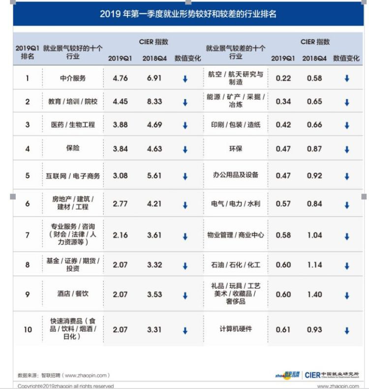 4月20日,智聯(lián)招聘發(fā)布2019年第一季度《中國就業(yè)市場(chǎng)景氣報(bào)告》。報(bào)告顯示,一季度就業(yè)景氣指數(shù)呈季節(jié)性下降,為1.68。本季度,教育 /培訓(xùn) /院校的招聘需求出現(xiàn)逆市上升,而金融業(yè)招聘職位數(shù)降幅在所有行業(yè)中最大。