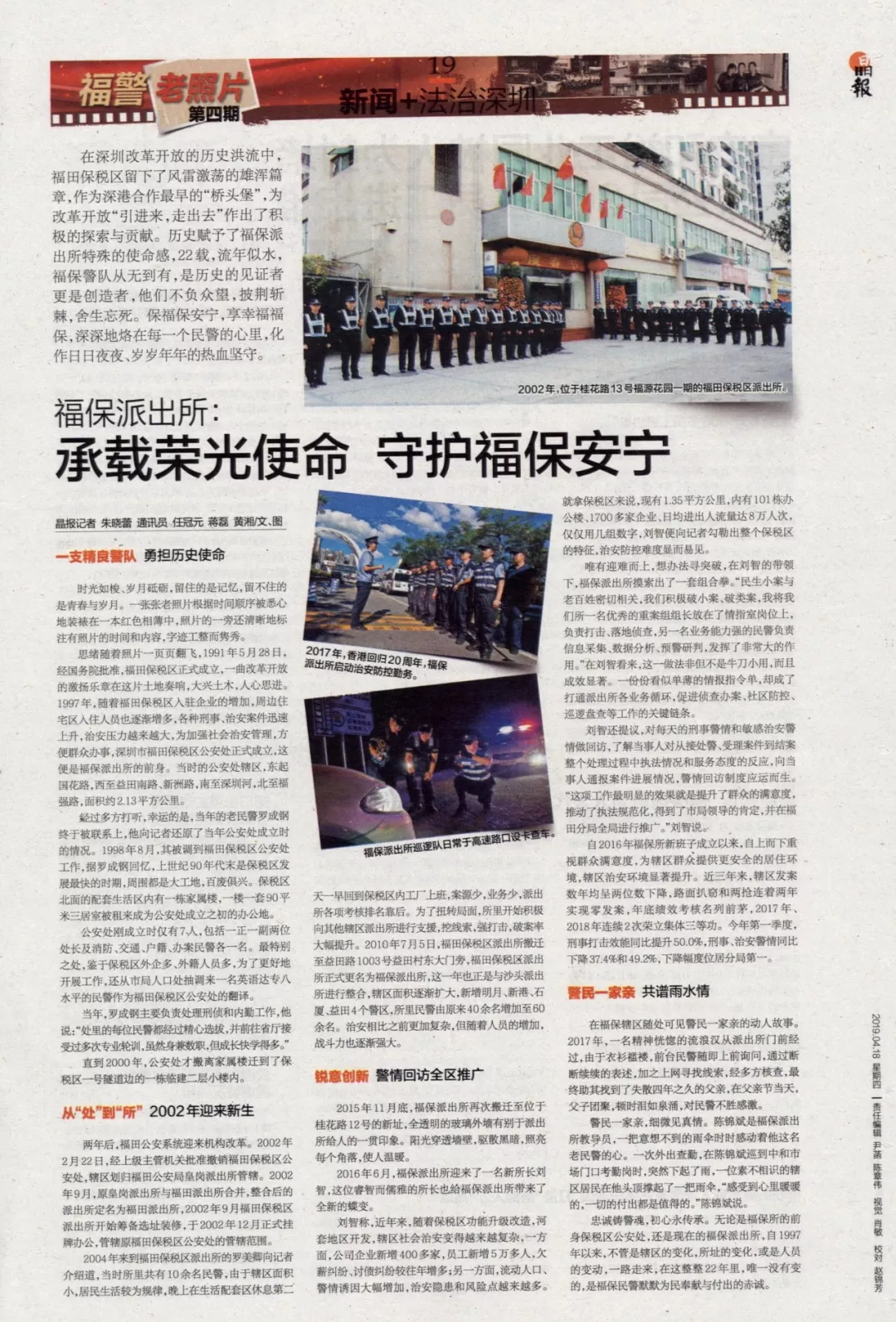 思緒隨著照片一頁頁翻飛,1991年5月28日,經(jīng)國務(wù)院批準(zhǔn),福田保稅區(qū)正式成立,一曲改革開放的激揚樂章在這片土地奏響,大興土木,人心思進。1997年,隨著福田保稅區(qū)入駐企業(yè)的增加,周邊住宅區(qū)入住人員也逐漸增多,各種刑事、治安案件迅速上升,治安壓力越來越大,為加強社會治安管理,方便群眾辦事,深圳市福田保稅區(qū)公安處正式成立,這便是福保派出所的前身。當(dāng)時的公安處轄區(qū),東起國花路,西至益田南路、新洲路,南至深圳河,北至福強路,面積約2.13平方公里。