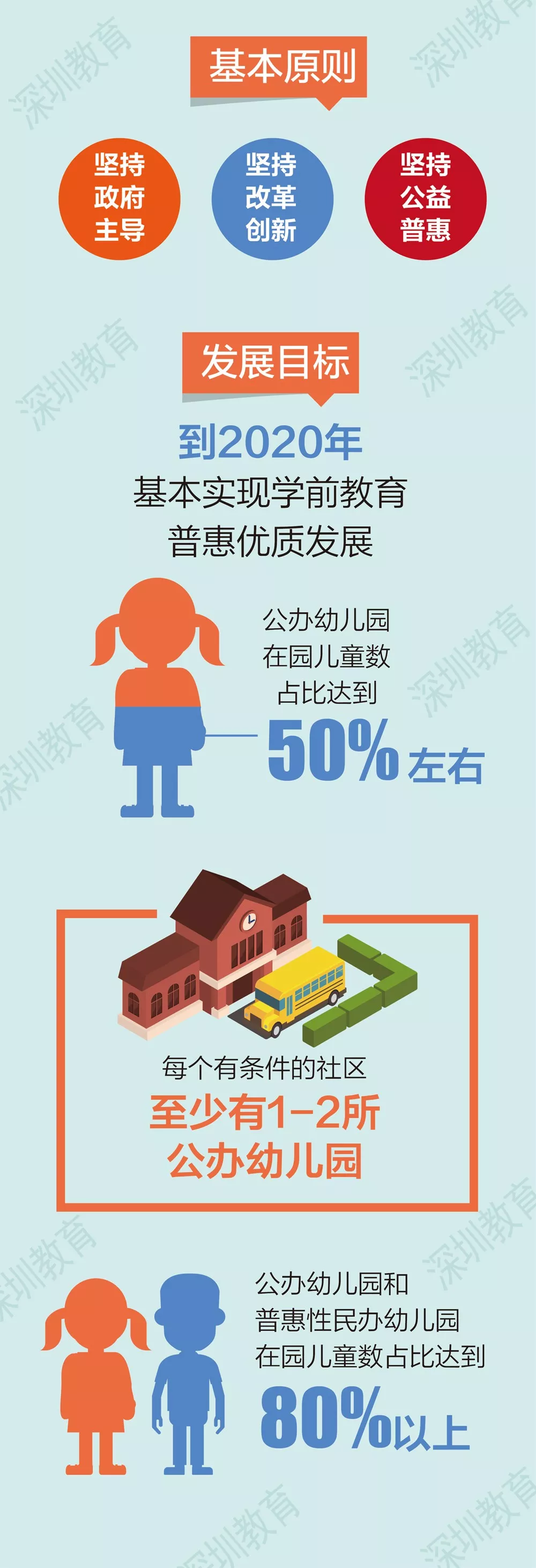 目前深圳共有各類幼兒園1771所,其中,公辦幼兒園共68所,占比僅3.8%。根據(jù)《意見》及《通知》的內(nèi)容,到2020年,全市幼兒園總量預(yù)計(jì)達(dá)到1967所,其中公辦園和普惠性幼兒園占比達(dá)到80%以上,公辦園約984所,在園兒童占比達(dá)到50%;普惠性民辦幼兒園約590所,占比30%以上;營(yíng)利性民辦幼兒園393所,占比20%以內(nèi)。深圳將用3-5年時(shí)間,基本實(shí)現(xiàn)學(xué)前教育普惠優(yōu)質(zhì)多樣化發(fā)展。