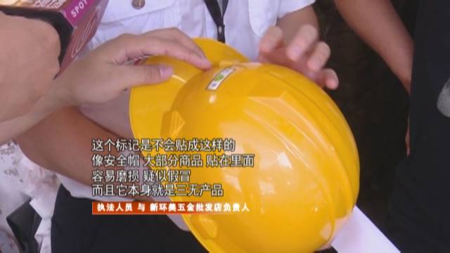 在新環(huán)美五金批發(fā)店,銷售的所有安全帽,除了寫有一個(gè)“安鑒”的字樣外,就再?zèng)]有任何標(biāo)識(shí),而且“安鑒”標(biāo)志粘貼也不符合規(guī)范,明顯也屬于三無產(chǎn)品。