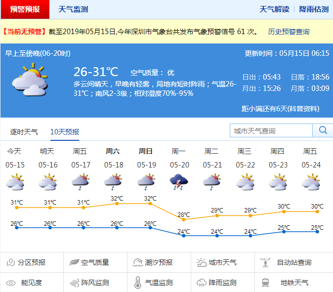 預(yù)計(jì)未來(lái)幾天持續(xù)炎熱,其中,15日深圳以多云天氣為主,局地有短時(shí)陣雨,早晚有輕霧,氣溫26℃至31℃;16日至19日持續(xù)炎熱,最高氣溫達(dá)32℃,以多云為主,局地有陣雨或雷陣雨;20日前后將有一次明顯降雨過(guò)程。
