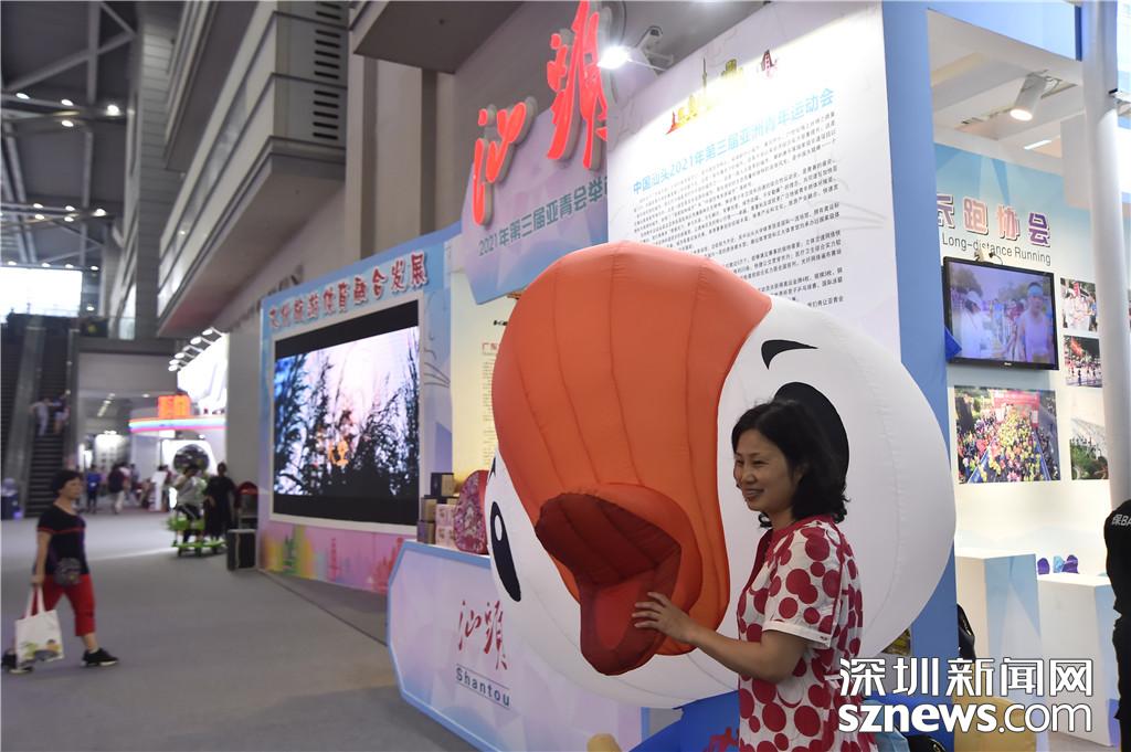 汕頭市展區(qū)前,市民與吉祥物合影留念