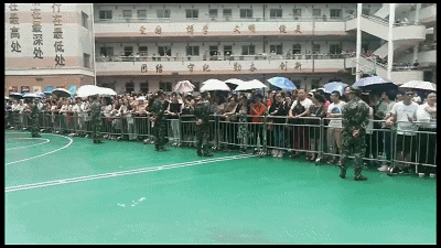 當天在蜂擁的人群中,有一個人在家長群里火了,視頻里他身穿警服,拿著喇叭在現(xiàn)場維持秩序。