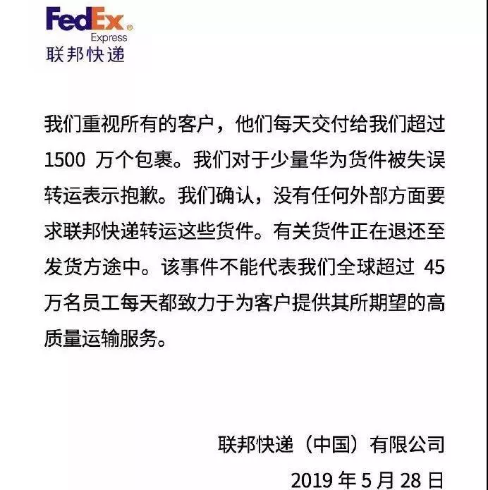 聯(lián)邦快遞(中國(guó))公司28日在其社交媒體官方賬號(hào)稱,“我們對(duì)于少量華為貨件被失誤轉(zhuǎn)運(yùn)表示抱歉。我們確認(rèn),沒有任何外部方面要求聯(lián)邦快遞轉(zhuǎn)運(yùn)這些貨件。有關(guān)貨件正在退還至發(fā)貨方途中。”