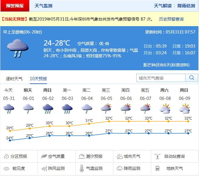 記者從深圳市氣象局了解到目前我市仍處于龍舟水活躍期,31日至6月3日多局地暴雨。31日有中到大雨,局部暴雨;1日有陣雨,天氣轉趨悶熱,2-3日降雨再次加強,有大雨到暴雨,伴有雷暴;展望4-6日,仍多陣雨。