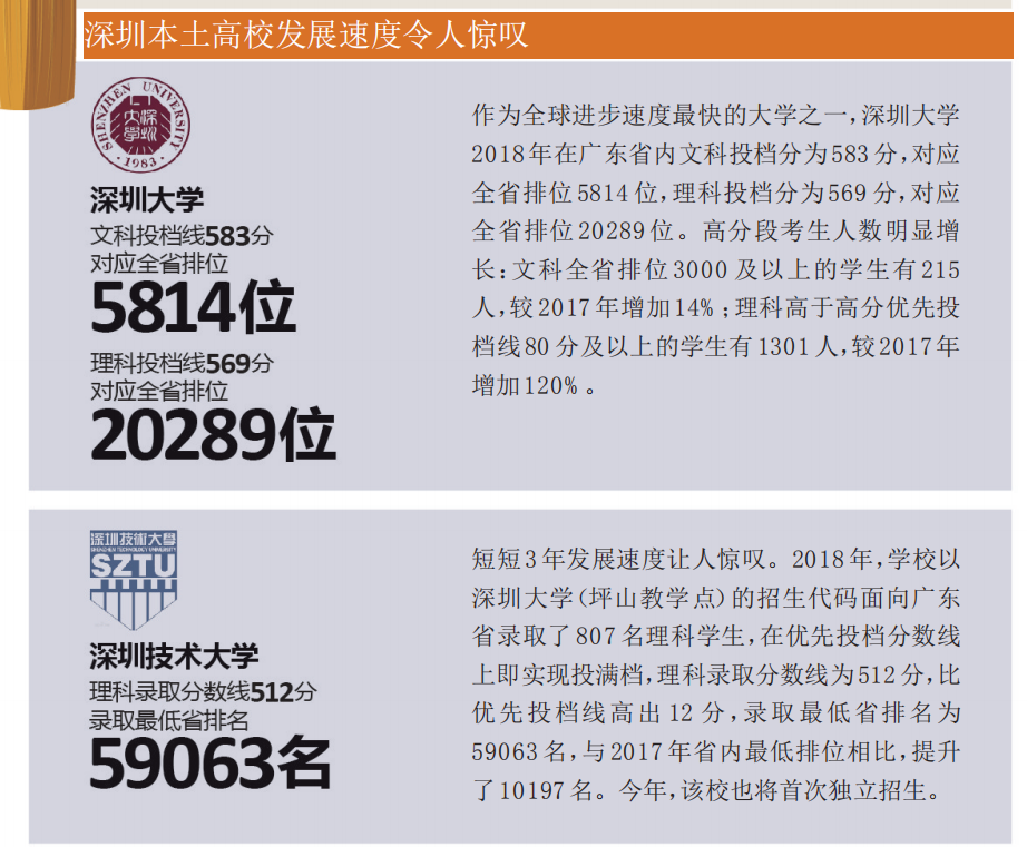 作為全球進(jìn)步速度最快的大學(xué)之一,深圳大學(xué)2018年在廣東省內(nèi)文科投檔分為583分,對應(yīng)全省排位5814位,理科投檔分為569分,對應(yīng)全省排位20289位。高分段考生人數(shù)明顯增長:文科全省排位3000及以上的學(xué)生有215人,較2017年增加14%;理科高于高分優(yōu)先投檔線80分及以上的學(xué)生有1301人,較2017年增加120%。
