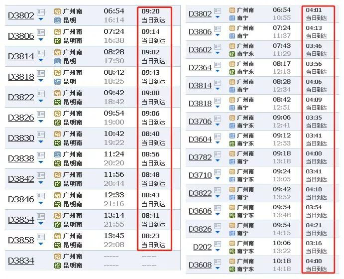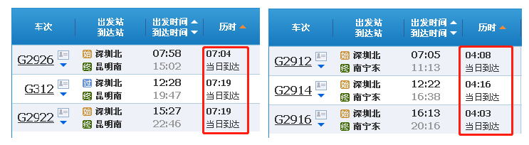 深圳前往昆明、南寧的車次少得可憐,但從廣州去的多呀!
