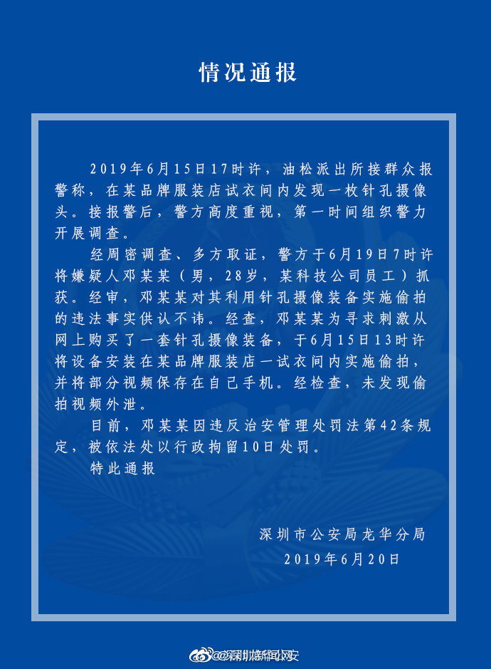 6月19日,深圳市一家優(yōu)衣庫門店暗藏針孔攝像頭一事有了最新進展。龍華警方表示,嫌疑人鄧某某(男,28歲)已被抓獲,其為某科技公司員工,為求刺激安裝,目前被依法處以行拘10日處罰,未發(fā)現(xiàn)視頻外泄。