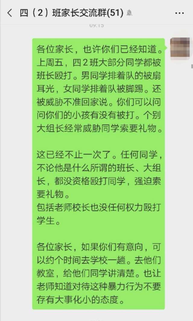據(jù)女兒反映,當(dāng)天上午課間時分,班長(女)將班上的學(xué)生集合在一起,以違反紀(jì)律為由要體罰他們?!叭嗝麑W(xué)生排著隊被班長毆打,男生被扇耳光,女生被腳踢。”