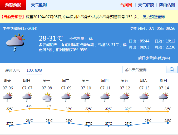 深圳新聞網(wǎng)2019年7月5日訊 第4號臺風(fēng)“木恩”(熱帶風(fēng)暴級)已經(jīng)于4日早上登陸越南北部沿海,對深圳影響減弱。據(jù)深圳市氣象局消息,今日深圳多云間陰天,有短時陣雨或雷陣雨;氣溫28-31℃;