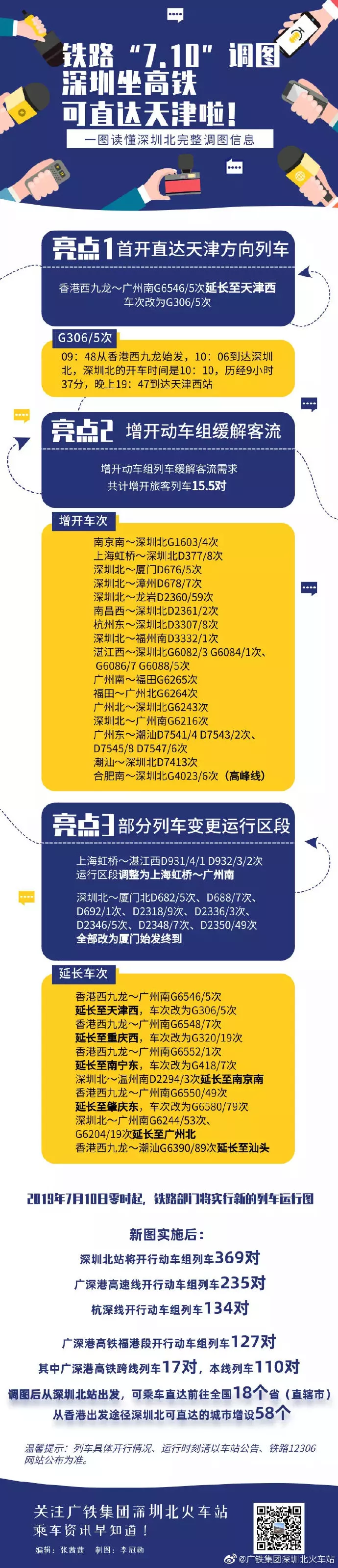 根據(jù)新的運(yùn)行圖安排,深圳北站將開(kāi)行動(dòng)車組列車369對(duì),廣深港高速線開(kāi)行動(dòng)車組列車235對(duì);杭深線開(kāi)行動(dòng)車組列車134對(duì)?!?·10”調(diào)圖后,深圳北站首開(kāi)前往天津方向列車,屆時(shí)從深圳北站出發(fā),可乘車直達(dá)前往全國(guó)18個(gè)省(直轄市);從香港出發(fā)途徑深圳北可直達(dá)的城市增設(shè)58個(gè)。