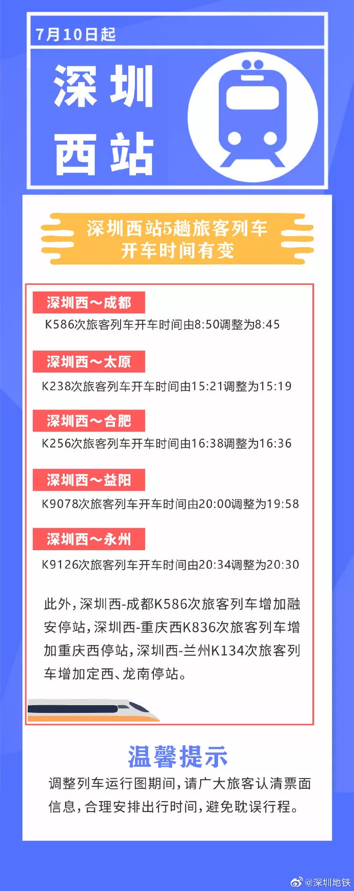 深圳西站有5趟旅客列車開(kāi)車時(shí)間有變,3趟旅客列車增加停車站。