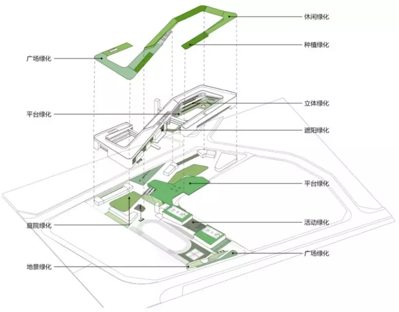 龍華區(qū)行知學(xué)校用地被西側(cè)的城市綠地、東南角的獅徑公園所包裹,具備天然的景觀優(yōu)勢。在內(nèi)部布局中,將場地、屋頂、架空層、立面結(jié)合起來,賦予多層次的綠化空間,打造真正的綠色校園。