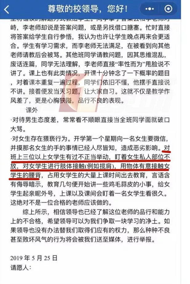 李先生向記者提供了一份,據(jù)稱是學生寫的聯(lián)名信,關于這位老師的不當品行,其中寫道“對班上三位以上女學生有過不正當舉動,盯著女生私人部位不放,對女學生進行肢體接觸,例如攬肩,用物體有意接觸女學生的腰背,給女生起親昵外號”。