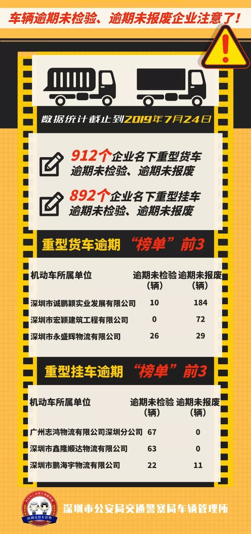見圳客戶端·深圳新聞網2019年7月26日訊(見圳客戶端 深圳新聞網記者 何暢)車輛逾期未檢驗、逾期未報廢,存在著重大交通安全隱患,深圳部分企業(yè)不重視安全管理、名下有大量“問題車輛”未處理。7月26日“深圳交警權威發(fā)布”微信公眾號就對相關企業(yè)進行了點名曝光。