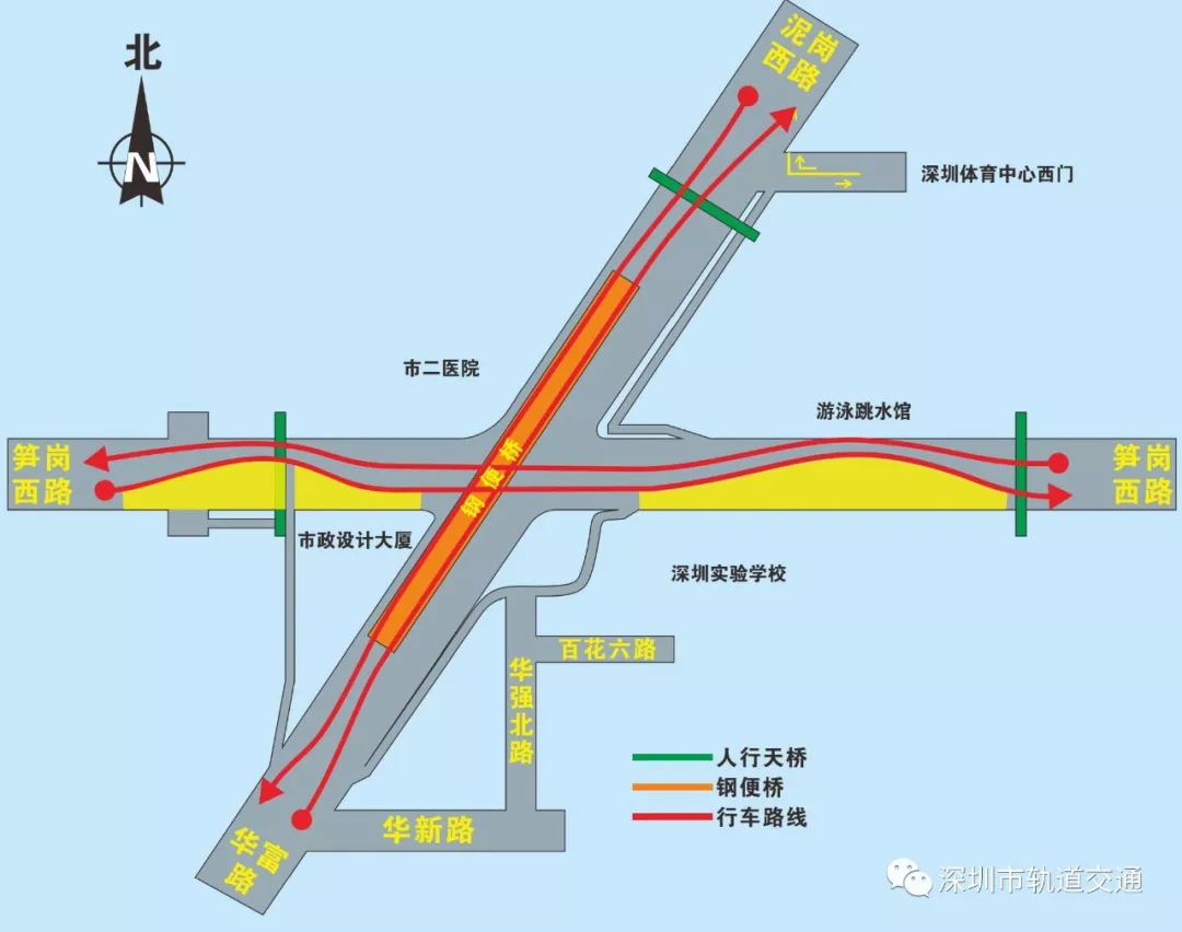 南北向:華富路—泥崗西路取消原通過平交路口的車道,轉為通過上鋼便橋?qū)崿F(xiàn)自南向北通行;東西向:筍崗西路東西向直行交通保持不變,取消原平交路口的紅綠燈。(詳見圖3)