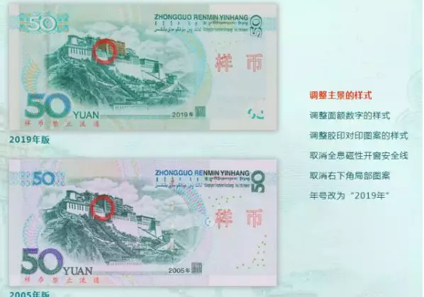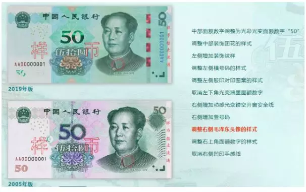 2019年版第五套人民幣50元、20元、10元、1元紙幣分別保持2005年版第五套人民幣50元、20元、10元紙幣和1999年版第五套人民幣1元紙幣規(guī)格、主圖案、主色調(diào)、“中國(guó)人民銀行”行名、國(guó)徽、盲文面額標(biāo)記、漢語(yǔ)拼音行名、民族文字等要素不變,提高了票面色彩鮮亮度,優(yōu)化了票面結(jié)構(gòu)層次與效果,提升了整體防偽性能。2019年版第五套人民幣50元、20元、10元、1元紙幣調(diào)整正面毛澤東頭像、裝飾團(tuán)花、橫號(hào)碼、背面主景和正背面面額數(shù)字的樣式,增加正面左側(cè)裝飾紋樣,取消正面右側(cè)凹印手感線和背面右下角局部圖案,票面年號(hào)改為“2019年”。
