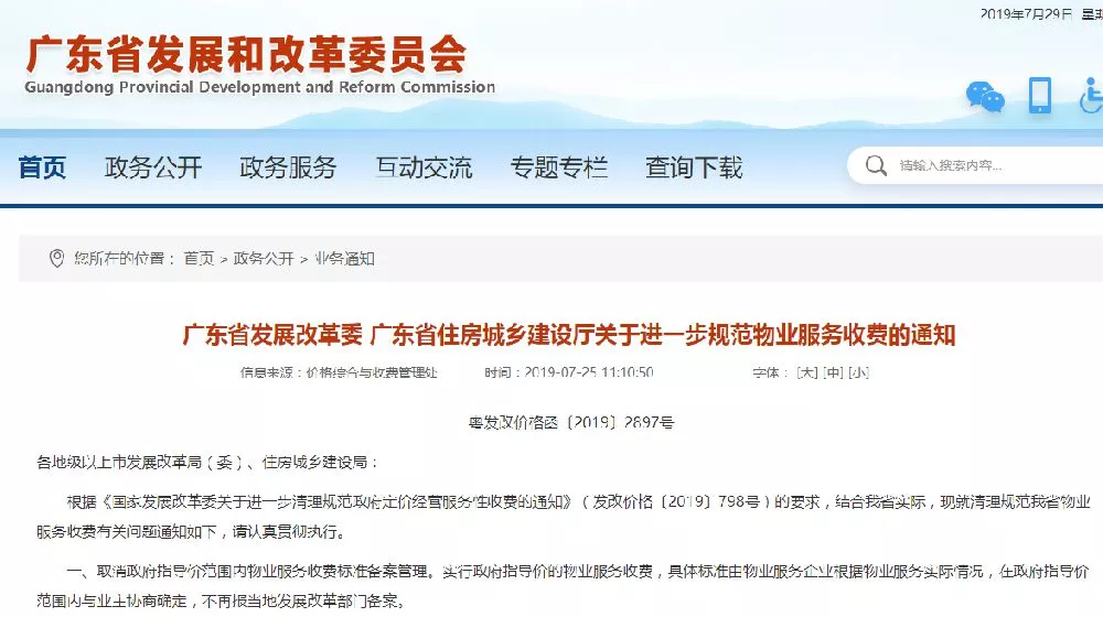 廣東省物業(yè)服務(wù)收費(fèi)規(guī)范新規(guī)定自2019年8月1日起執(zhí)行。實(shí)行政府指導(dǎo)價(jià)的物業(yè)服務(wù)收費(fèi),具體標(biāo)準(zhǔn)由物業(yè)服務(wù)企業(yè)根據(jù)物業(yè)服務(wù)實(shí)際情況,在政府指導(dǎo)價(jià)范圍內(nèi)與業(yè)主協(xié)商確定,不再報(bào)當(dāng)?shù)匕l(fā)展改革部門備案。