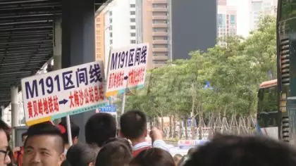 今天周六,準(zhǔn)備去往東部大小梅沙等景區(qū)的游客,擠滿了黃貝嶺公交站的站臺,巴士集團的工作人員,也是手舉線路標(biāo)識牌,在站臺維持秩序。