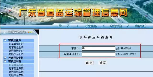 登錄廣東省道路運輸管理信息網(wǎng),點擊左側(cè)菜單欄中的「客貨運車輛」,再點擊「客班車客運車輛」,就能進(jìn)入到查詢頁面。