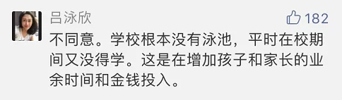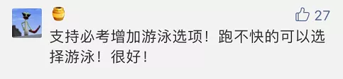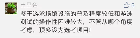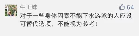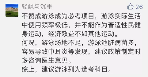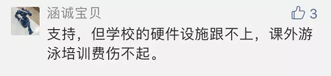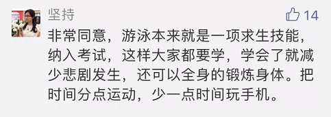 對于游泳納入中考體育必考選項,家長們的看法不一。支持者認為,“游泳本來就是一項求生技能,納入考試,孩子們都要學習,除了鍛煉身體,還能減少意外的發(fā)生。”也有人認為“很多學校都沒有開設游泳課,學習硬件設施跟不上也白搭。”反對者則認為,“游泳實際生活中使用頻率極低,并不能作為普適性健身運動,納入選考更合適”“學校的硬件設施跟不上,課外游泳培訓費傷不起。”