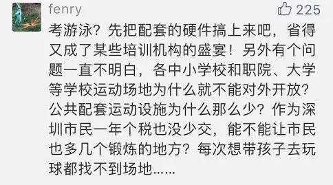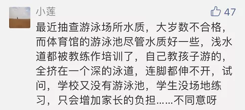 在留言中,多數(shù)家長表示,如果確定將游泳納入中考體育必考選項,希望學校體育教學也能進行相關配套。而小編了解到解到,目前深圳小學、初中學校開設游泳課最大的難點在于場地。