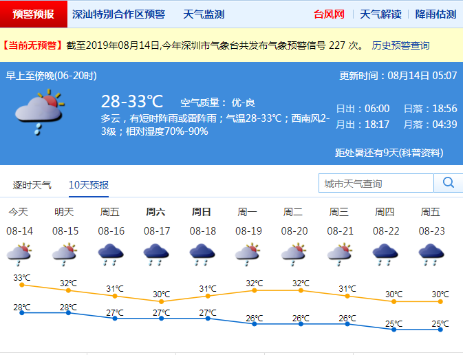 深圳今日最高氣溫33℃,有短時(shí)雷陣雨 請(qǐng)注意帶傘并防暑降溫