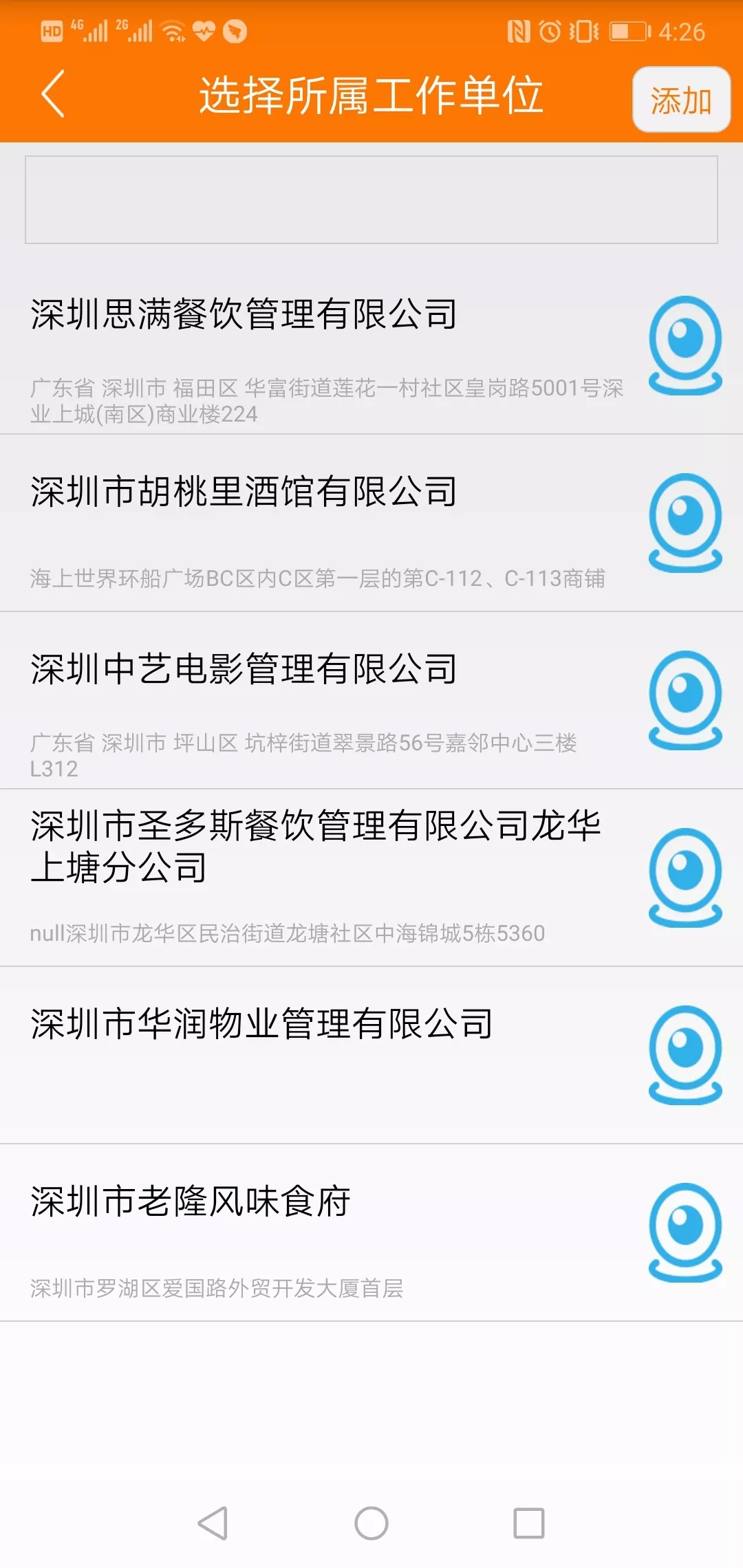 在選擇所屬單位時(shí),可以通過搜索“名稱關(guān)鍵詞”快速查詢,如果沒有你的餐廳或單位名字,可以點(diǎn)右上角的【添加】來添加。