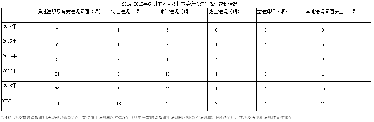 2018年,深圳在立法保障改革、立法推動改革、立法規(guī)范改革方面的步伐越邁越大,在加大特區(qū)立法權(quán)使用,制定特區(qū)條例促進(jìn)改革創(chuàng)新和保障經(jīng)濟(jì)社會發(fā)展外,根據(jù)改革的需要,及時(shí)修改和廢止與經(jīng)濟(jì)社會發(fā)展不相符的法規(guī),采用暫停法規(guī)性文件的適用、暫時(shí)調(diào)整和暫停法規(guī)部分條款適用的方式,為改革探索提供法治依據(jù)。全年通過新的特區(qū)條例5項(xiàng),修訂法規(guī)23項(xiàng),廢止法規(guī)1項(xiàng),暫時(shí)調(diào)整和暫停適用法規(guī)10項(xiàng)。