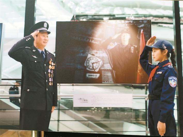 ▲廣東公安百名英模肖像攝影展中,傅建文(左)在現(xiàn)場(chǎng)解說(shuō)照片由來(lái)。