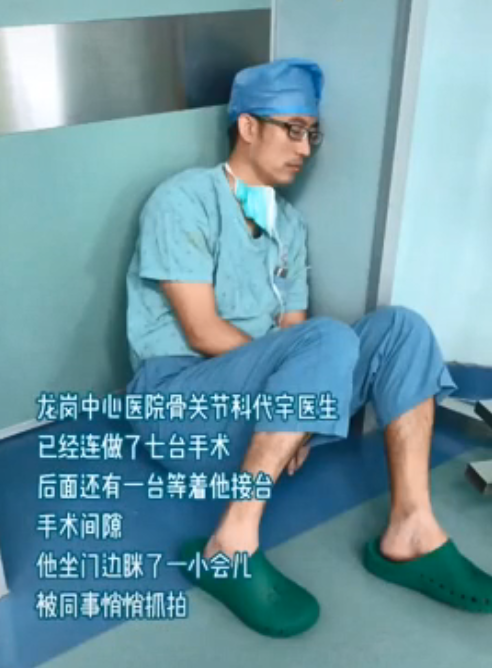 他連做7臺手術(shù),在第8臺手術(shù)開始前的間隙,靠著墻睡著了