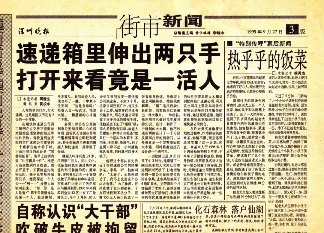 而歷史賦予這支鐵軍的特殊使命任務(wù)則是重拳打擊口岸走私和偷渡犯罪。皇崗口岸派出所老職工桂錫梁至今還珍藏著一份些許泛黃的舊報(bào)紙,一篇名為“速遞箱里伸出兩只手,打開(kāi)來(lái)看竟是一活人”的報(bào)道記錄了1999年9月22日曾發(fā)生的一起偷渡案件。作為當(dāng)時(shí)參與處置的一員,桂錫梁回憶道,犯罪分子將自己裝進(jìn)一個(gè)特制的大木箱中,偽裝成裝有“沖壓模具”發(fā)往香港的快遞箱,計(jì)劃偷渡出境,最終在位于皇崗口岸附近的快遞轉(zhuǎn)運(yùn)點(diǎn)被警方查獲。