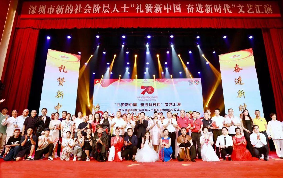 演出前,深圳市新的社會(huì)階層人士同心藝術(shù)團(tuán)揭牌。本次文藝匯演是在市委統(tǒng)戰(zhàn)部指導(dǎo)下,以及各區(qū)統(tǒng)戰(zhàn)部門支持下,由市新聯(lián)會(huì)牽頭,聯(lián)合各區(qū)新聯(lián)會(huì)共同舉辦的獻(xiàn)禮新中國成立70周年慶?;顒?dòng)之一。現(xiàn)場氣氛喜慶溫馨,通過網(wǎng)絡(luò)直播的方式和場外新的社會(huì)階層人士和十多萬名觀眾互動(dòng)。