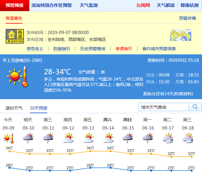 見圳客戶端·深圳新聞網(wǎng)2019年9月9日訊 深圳市氣象局官方微博消息,這周天氣炎熱伴有雷陣雨:周一多云,有短時(shí)雷陣雨,氣溫28-34℃;周二到周三日多云,有(雷)陣雨;周四到周六天氣晴熱,午后有熱雷雨。高溫黃色預(yù)警信號(hào)生效中,請(qǐng)注意防暑降溫及午后熱雷雨。