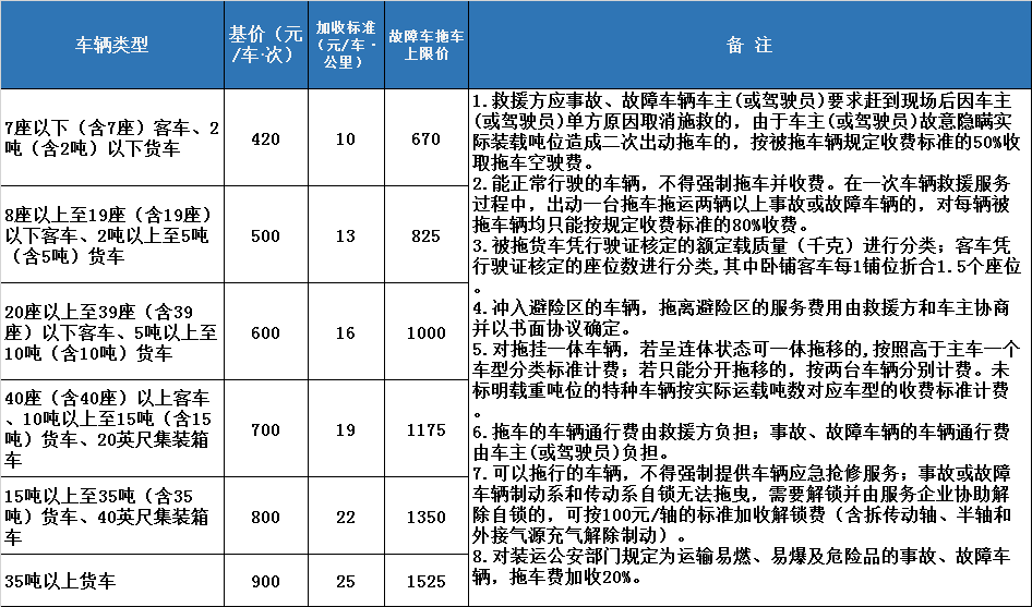 廣東省高速公路拖車服務(wù)收費(fèi)標(biāo)準(zhǔn)見(jiàn)下表: