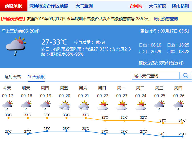 記者從市氣象局了解到,深圳17日多云有陣雨或雷陣雨;氣溫27-33℃;東北風(fēng)2-3級;相對濕度65%-95%。18-19日晴天間多云,天氣悶熱,午后局地有短時陣雨;20-23日晴熱干燥。