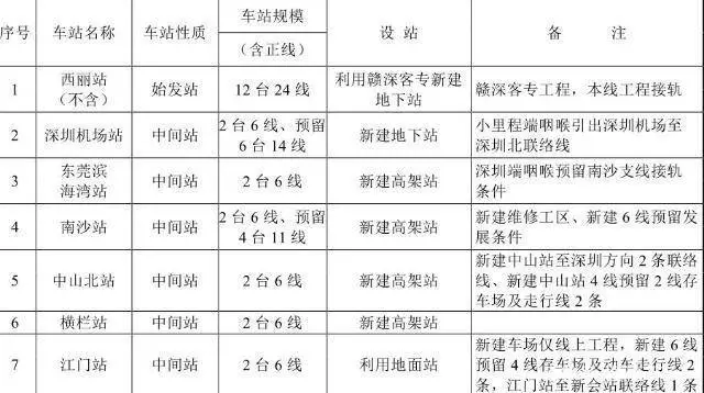 新建深茂鐵路深圳至江門段為高速鐵路,雙線。正線西麗至南沙段及深圳北至深圳機(jī)場(chǎng)聯(lián)絡(luò)線時(shí)速200公里,正線南沙至江門段時(shí)速250公里;新建設(shè)西麗、深圳機(jī)場(chǎng)、濱海灣、南沙、中山北、橫欄、江門共7座車站。