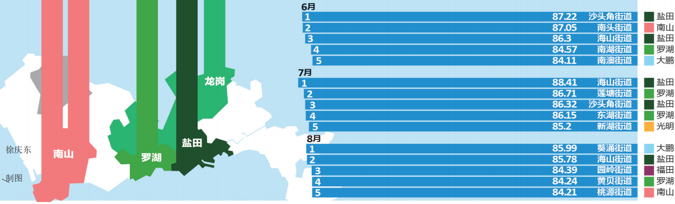 推進(jìn)環(huán)境質(zhì)量邁進(jìn)國(guó)際一流,深圳一直在行動(dòng)。細(xì)心的市民可能早已發(fā)現(xiàn),深圳市城市管理和綜合執(zhí)法局官方網(wǎng)站每個(gè)月都會(huì)發(fā)布“深圳市環(huán)境衛(wèi)生指數(shù)排行榜”,為深圳的環(huán)境衛(wèi)生“打分”。據(jù)了解,深圳市環(huán)境衛(wèi)生指數(shù)測(cè)評(píng)排名已連續(xù)開(kāi)展了兩年半,有效促進(jìn)了全市環(huán)境衛(wèi)生的提升和轉(zhuǎn)變。今年上半年的“成績(jī)單”顯示,全市各區(qū)(新區(qū))各街道你追我趕,測(cè)評(píng)工作帶動(dòng)社區(qū)環(huán)境改善,環(huán)境衛(wèi)生的整治提升得到了市民的廣泛認(rèn)可和好評(píng)。