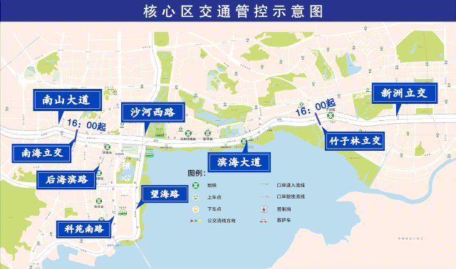 以深圳灣人才公園為中心,濱海大道(南海立交至竹子林立交段雙方向)、沙河西路(濱海大道至東濱立交雙方向)、望海路(東濱立交至中心段雙方向)、中心路(科苑南路至望海路雙方向)、科苑南路(東濱路至中心路段東側(cè))、東濱路(后海濱路至科苑南路段,不含)、后海濱路(濱海大道至東濱路,不含)的合圍區(qū)域?qū)嵤┙煌ü苤?;以及濱海大道東往西方向(竹子林立交至南海立交),西往東方向(南海立交至竹子林立交)實(shí)施交通管制。