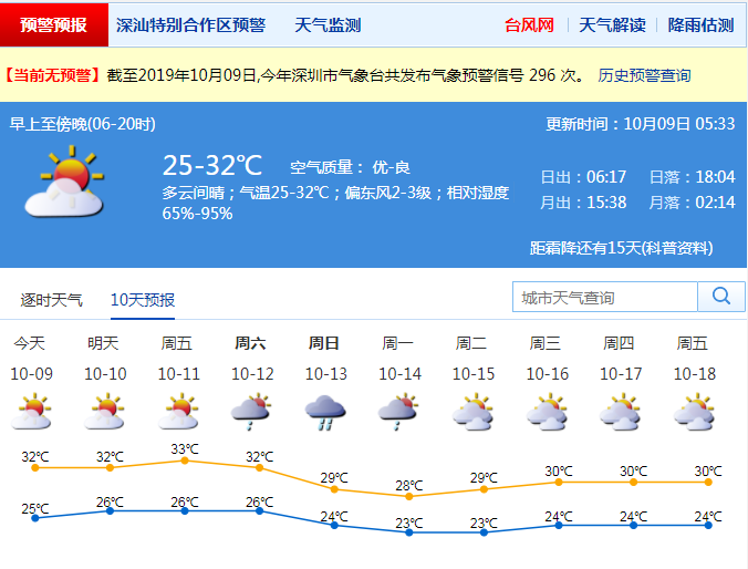 見圳客戶端·深圳新聞網(wǎng)2019年10月9日訊 據(jù)深圳市氣象局消息,9日,深圳多云間晴;氣溫25-32℃;偏東風2-3級;相對濕度65%-95%。