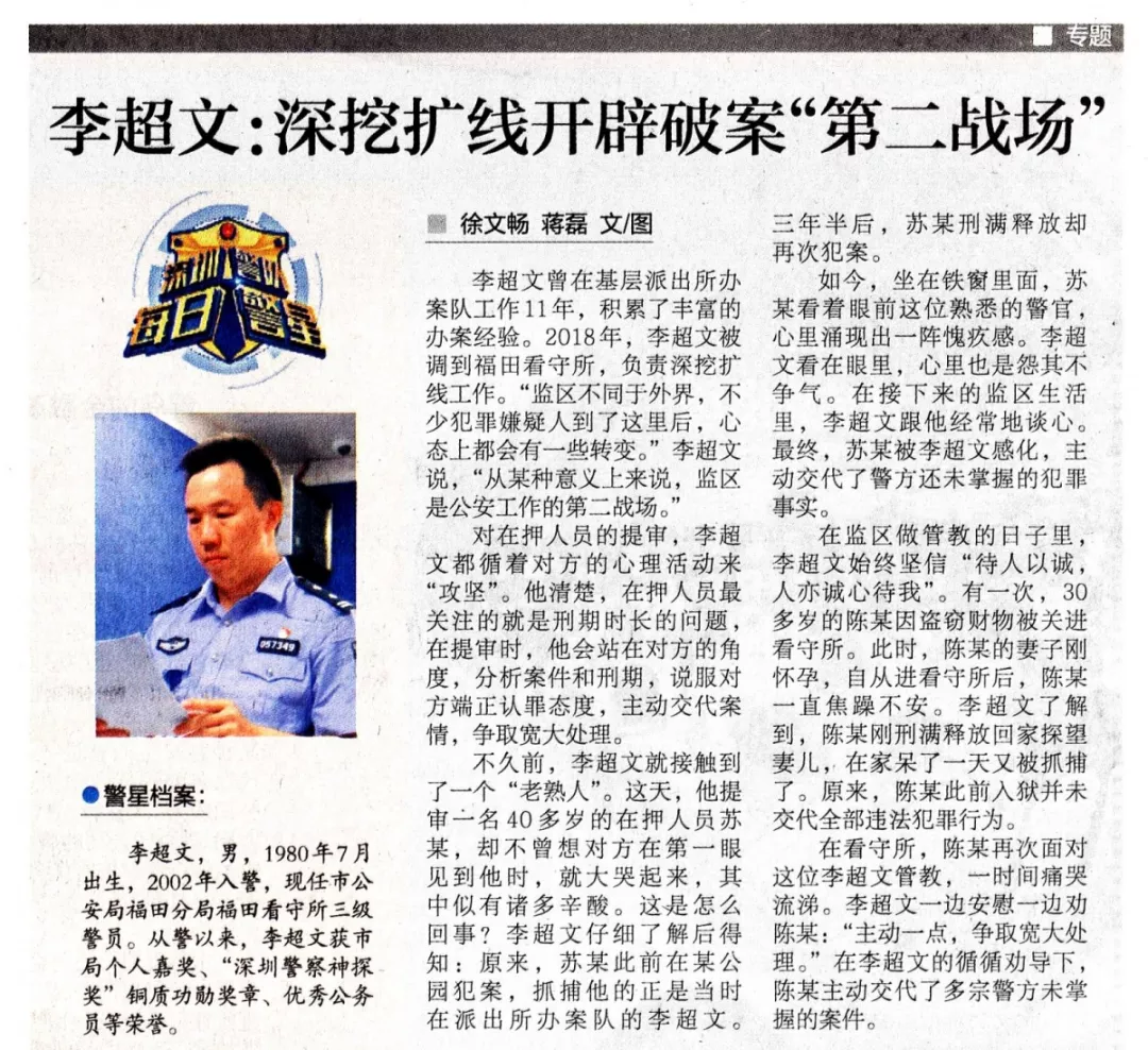 李超文曾在基層派出所辦案隊(duì)工作11年,積累了豐富的辦案經(jīng)驗(yàn)。2018年,李超文被調(diào)到福田看守所,負(fù)責(zé)深挖擴(kuò)線工作。“監(jiān)區(qū)不同于外界,不少犯罪嫌疑人到了這里后,心態(tài)上都會(huì)有一些轉(zhuǎn)變。”李超文說,“從某種意義上來說,監(jiān)區(qū)是公安工作的第二戰(zhàn)場(chǎng)?!?/p>