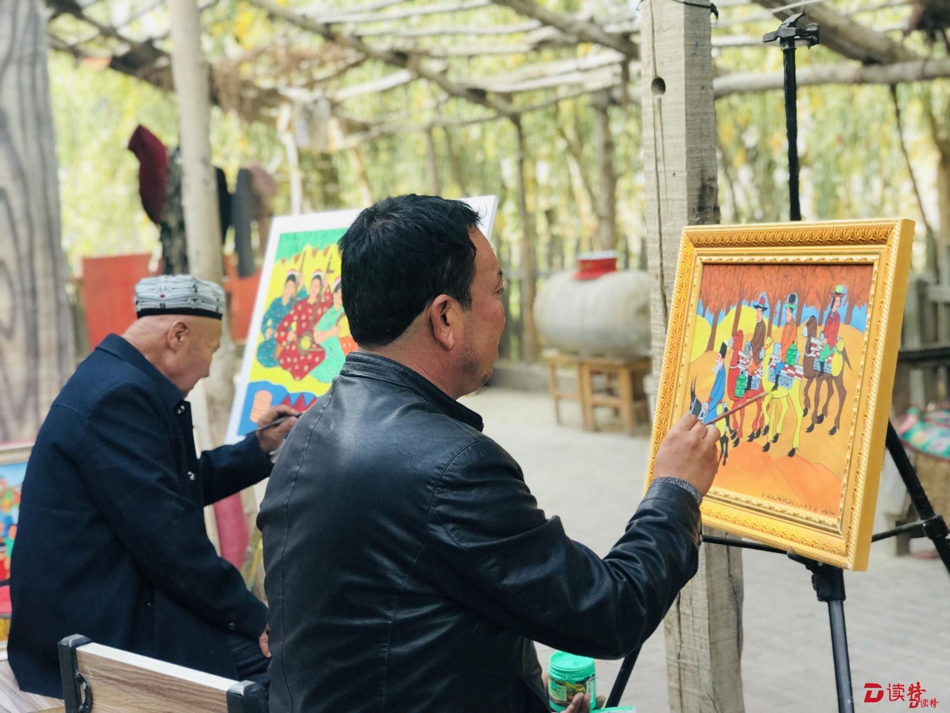 國(guó)家級(jí)農(nóng)民畫畫家木卡熱埔江·艾海提告訴記者記者,他現(xiàn)在一年有將近45000元的收入,一部分來(lái)自于在安居房上畫農(nóng)民畫,一年有30000塊錢的收入,另一部分是自己賣出的畫,一年能掙15000。“現(xiàn)在麥蓋提旅游的人多了,看到他們喜歡我的畫,我感到很高興,現(xiàn)在越畫越有勁了!”聊起麥蓋提的發(fā)展,木卡熱埔江的臉上難掩喜悅。