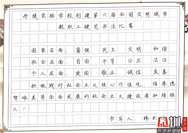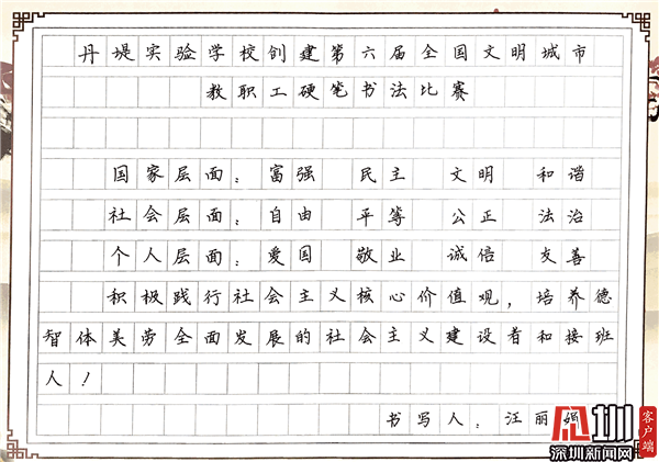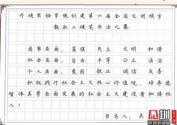 見圳客戶端·深圳新聞網(wǎng)10月29日訊(見圳客戶端、深圳新聞網(wǎng)記者 潘寶儀 通訊員 袁小俊 圖/朱雅琪 )  為落實立德樹人總目標、培育和踐行社會主義核心價值觀,創(chuàng)建文明城市,積極倡導全校教職工勤練教學基本功,提高教師綜合素養(yǎng),豐富課余生活,展示丹堤實驗學校教職工風采,學校于10月25日舉行了“創(chuàng)建第六屆全國文明城市教職工硬筆書法比賽”。