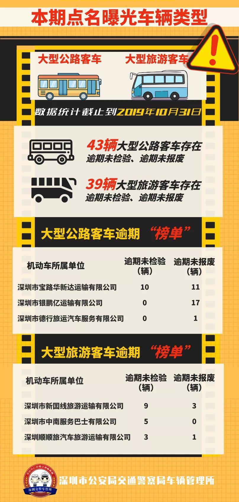 見圳客戶端·深圳新聞網(wǎng)2019年11月01日訊 部分企業(yè)、駕駛人忽視安全問題,對名下“逾期客車”遲遲不處理,存在著重大安全隱患。10月31日,深圳車管所微信公號消息對重點隱患車輛點名曝光。