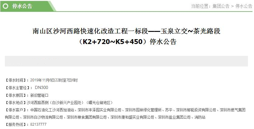 停水客戶中國(guó)石油化工沙河西加油站、深圳市豐澤園實(shí)業(yè)有限公司、深圳市園林綠化管理所、蘇平、深圳市郁能投資有限公司、深圳市燃?xì)饧瘓F(tuán)有限公司、深圳市白沙物流有限公司、深圳市糧食集團(tuán)有限公司、深圳市康和盛實(shí)業(yè)有限公司、深圳市鹽業(yè)集團(tuán)公司、消防站