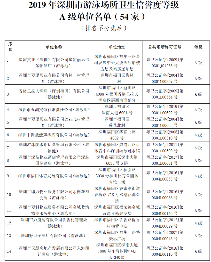 附:2019年深圳市游泳場(chǎng)所衛(wèi)生信譽(yù)度等級(jí)A級(jí)名單